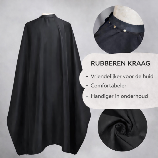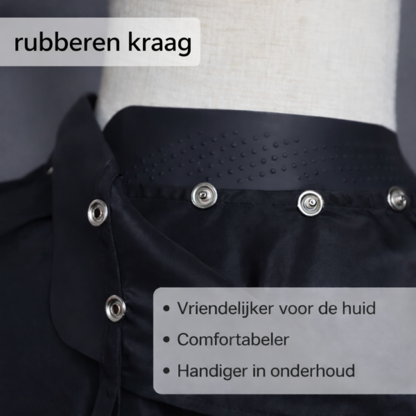 Geen aparte knipkraag meer nodig. Deze katmantel is voorzien van een vaste, huidvriendelijke rubberen kraag die perfect aansluit rond de hals. Dit zorgt voor extra bescherming tegen haren en producten.